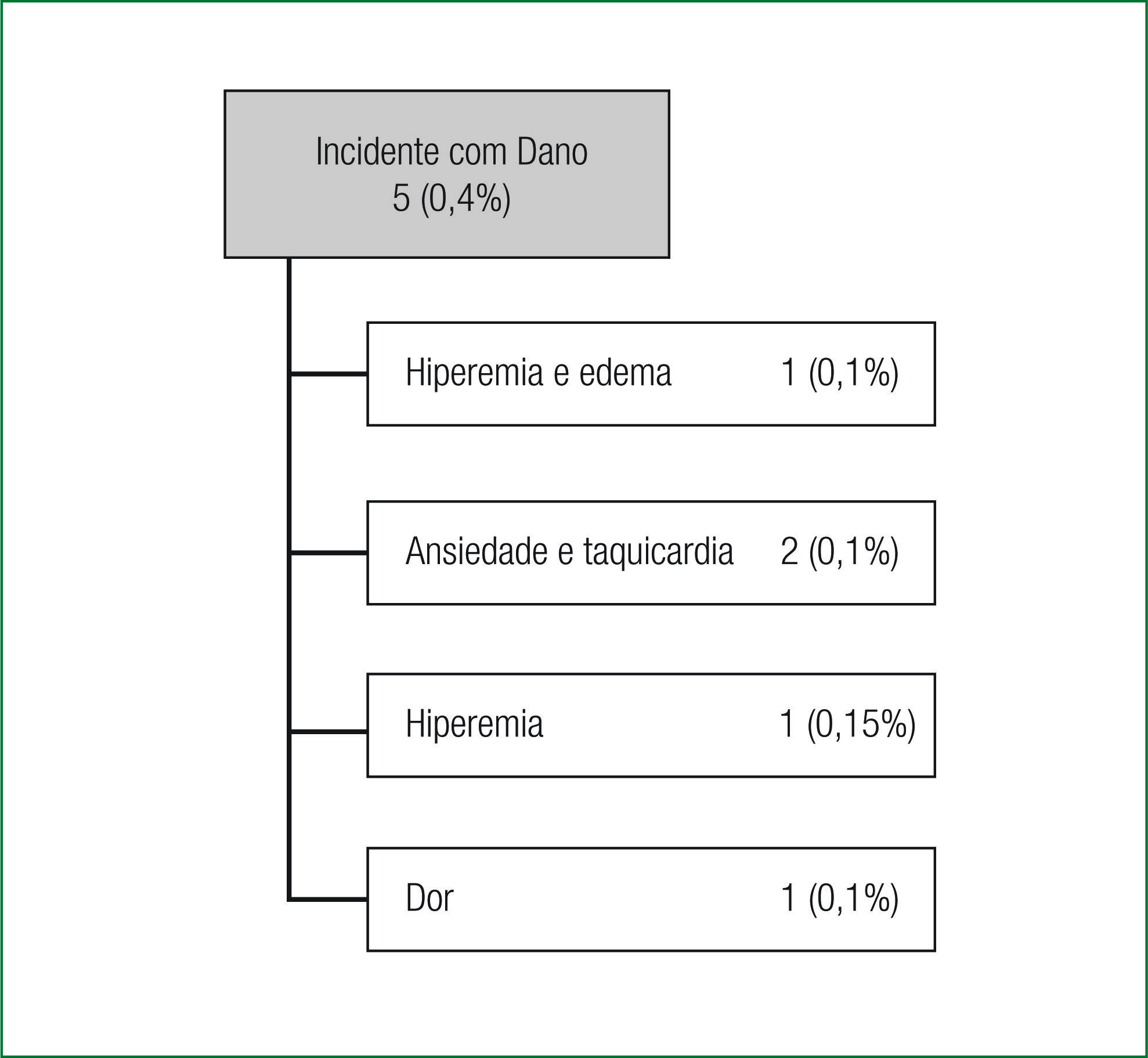 Foram identificados na pesquisa cinco (0,4%) incidentes, que causaram danos aos pacientes atendidos no Ambulatório de Quimioterapia. Estes caracterizaram-se por hiperemia e edema, ansiedade e taquicardia, hiperemia e dor, sendo todos eles registrados, logo após a administração de medicamentos. Os achados vão ao encontro do estudo(25) que encontrou cinco incidentes com dano a medicamentos em 1.437 registros, sendo eles também na fase da administração.