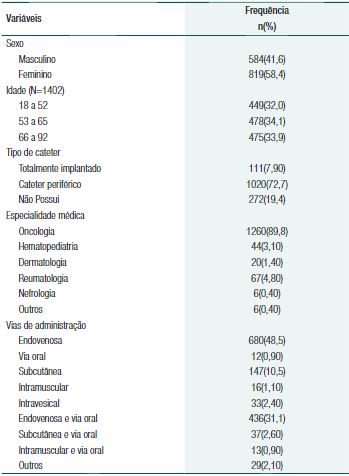 Durante o período de investigação, foram analisadas fichas de registros de 1.403 pacientes, com média de idade de 57,6 anos (DP=15,2), entre outras características conforme a tabela 1.