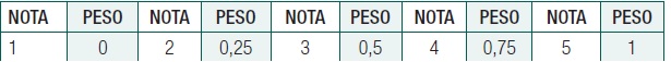 Posteriormente, os dados foram compilados e processados pelo programa IBM Statistical Package for the Social Science (SPSS), versão 20.0 for Windows. Para a análise da validação de conteúdo dos DEs pelos peritos da CIPE, foram verificados o índice de Kappa, índice de Validade de Conteúdo (IVC) e o teste binomial, considerada a última fase da pesquisa. Assim, Indices ponderados foram calculados para as pontuações atribuídas pelos peritos do centro CIPE® a cada DE. Com base numa escala Likert de cinco pontos (1 = nada pertinente; 2 = pouco pertinente; 3 = muito pertinente; 4 = pertinente; 5 = muitíssimo pertinente), para mensuração da importância de cada DE, foi calculada uma média aritmética ponderada das notas atribuídas por cada perito para cada DE com a finalidade de produzir o IVC, considerando os valores como apresentados no quadro 1.