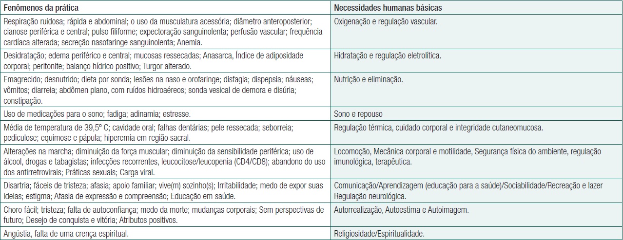 Conclusão: A identificação dos fenômenos da prática de enfermagem corrobora na elaboração dos diagnósticos, resultados e intervenções direcionados às necessidades prioritárias de pessoas vivendo com Aids.
