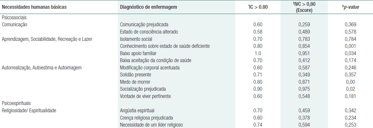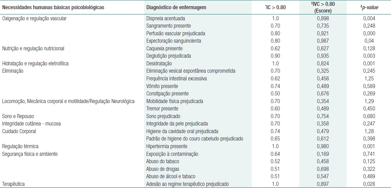 Assim, dos 72 fenômenos da prática de enfermagem foi possível a elaboração de 37 diagnósticos de enfermagem, os quais foram encaminhados para validação de conteúdo pelos peritos da CIPE®. O produto resultante da Validação de Conteúdo, levando-se em consideração o ponto de corte - Indice de Concordância (IC) e Indice de Validação de Conteúdo (IVC) ≥ 0.80 para os DE. Deste modo, apenas sete diagnósticos classificados dentro das necessidades psicobiologicas e quatro nas psicossociais atingiram tal escore, como mostra a tabela 1.