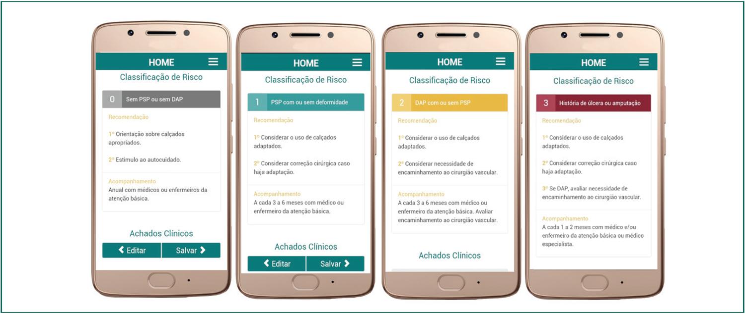 Resultados: O aplicativo móvel Cuidar Tech “Exame dos Pés” possui sete telas que integram os elementos para avaliação e classificação de risco e oito telas (formulários) com a sequência do exame, após sua execução aparece uma tela com a classificação de risco e os achados clínicos com as recomendações para cada tipo de risco.
