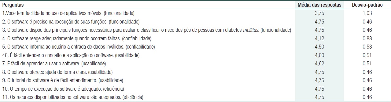 Inicialmente os enfermeiros receberam um estudo de caso com a finalidade de simular a prática de realização do exame dos pés de pessoas com diabetes mellitus. De posse deste caso, o avaliador consultava o aplicativo Cuidar Tech “Exame dos Pés” para realizar a avaliação e a classificação de risco do pé diabético. Em seguida, o enfermeiro respondia um questionário, validado em outro estudo e adaptado para o presente teste,(21) que aborda aspectos de funcionalidade, confiabilidade, usabilidade, eficiência e manutenibilidade.(21-23) Esse questionário utiliza uma escala Likert que permite respostas entre um (discordo fortemente) a cinco (concordo fortemente), a pontuação três indica casos de dúvida, se concorda ou discorda ou se o avaliador não se sente apto para responde-la. As pontuações iguais ou superior a quatro foram consideradas como adequadas.