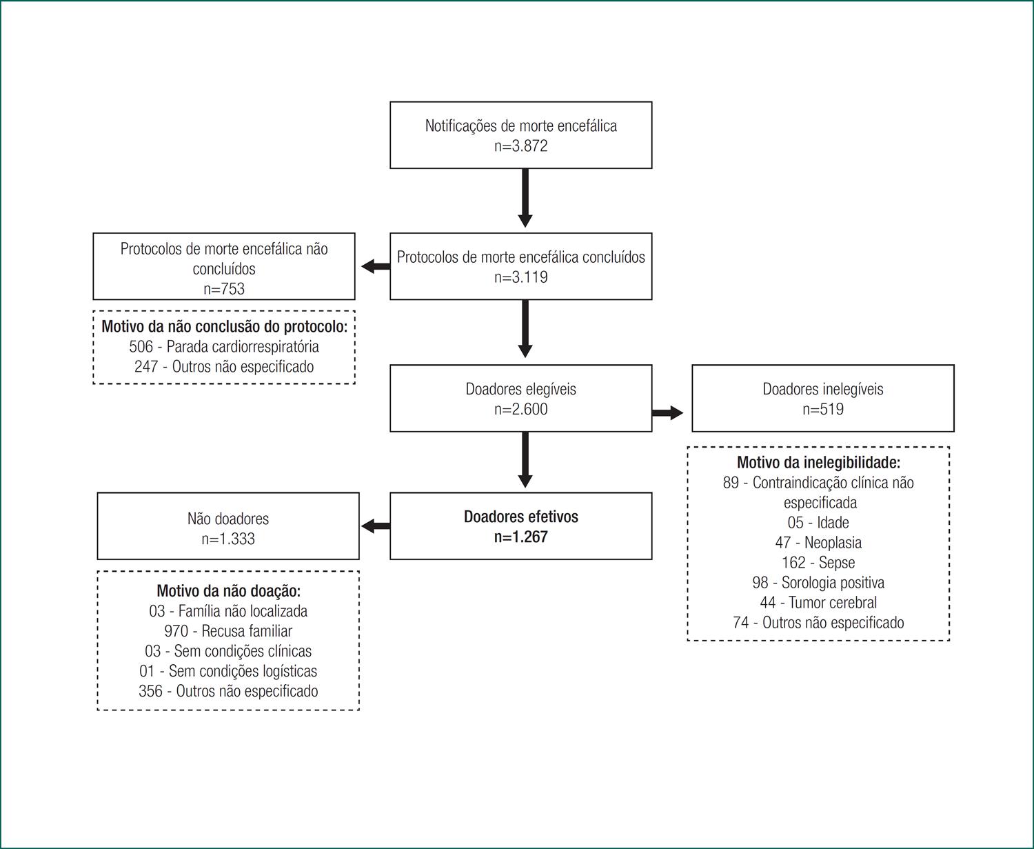 O processo de doação de órgãos para transplante está esquematizado na figura 1. Constatou-se que, dos 2.600 doadores elegíveis, 1.267 se tornaram doadores efetivos (48,7%).