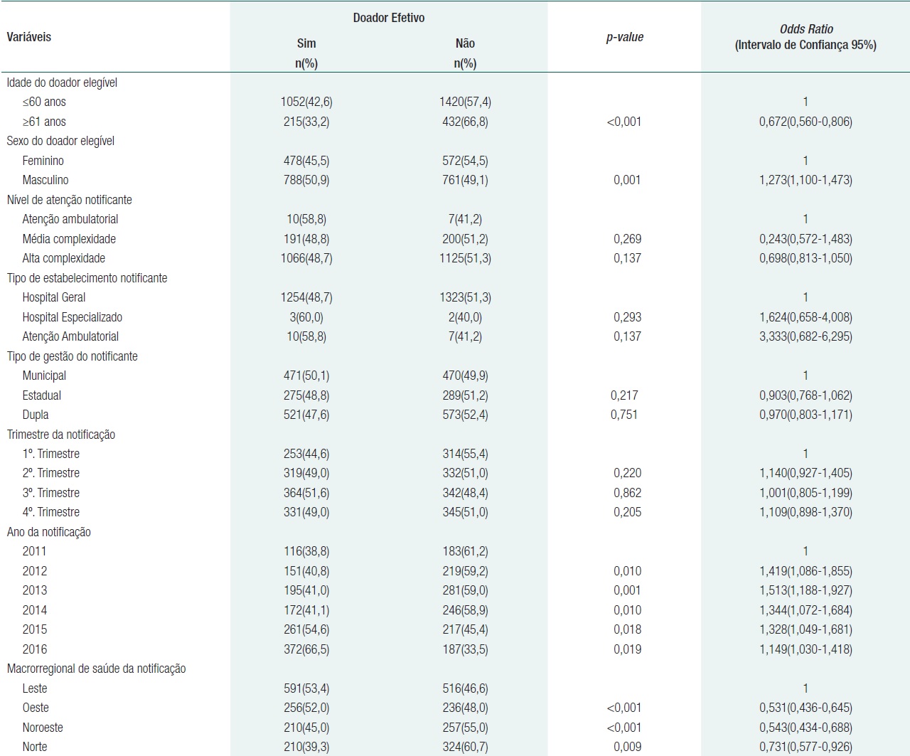 A chance de efetivação da doação foi significativamente maior entre os indivíduos com menos de 60 anos, do sexo masculino, cujos óbitos ocorreram nas Macrorregionais Leste e Oeste. Observou-se um aumento significativo no número de potenciais doadores e de doações efetivas com o avançar dos anos, um crescimento de 320,7% nos números absolutos e de 71,4% na proporção de efetivações, comparandose exclusivamente os anos de 2011 e 2016 (Tabela 1).