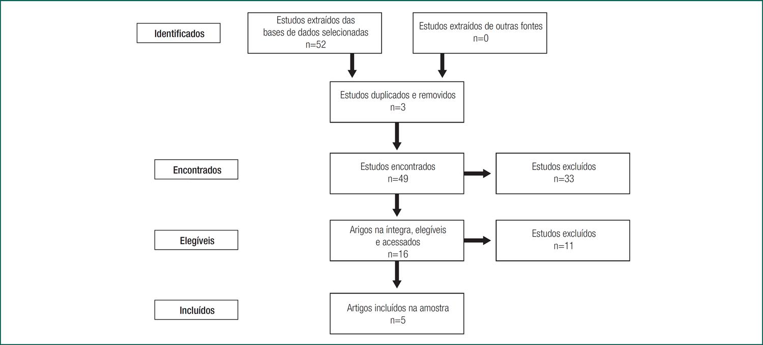 Definiram-se como critérios de inclusão: estudos primários sobre o tema, publicados até junho de 2017, em qualquer idioma. Pesquisas de revisão, respostas a artigos e editoriais foram excluídos. As buscas foram efetuadas em novembro de 2017 por dois pesquisadores simultaneamente. A análise para a seleção de material foi feita em três etapas: