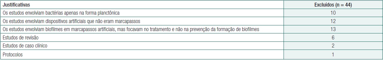 Os critérios que levaram à exclusão de 44 estudos primários são apresentados no quadro 1.
