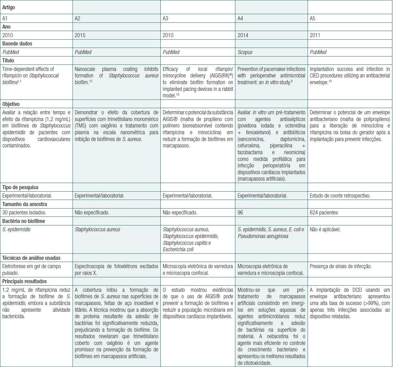 Os cinco artigos incluídos na presente revisão foram denominados de A1 a A5 para propósitos didáticos. Todas as publicações foram escritas em inglês e publicadas entre 2010 e 2015. Houve uma concentração de artigos na base de dados PubMed (75%). Em geral os estudos tinham como objetivo avaliar o potencial de agentes antimicrobianos, farmacológicos, químicos e/ou físicos para evitar ou minimizar a formação de biofilmes em marcapassos artificiais (Quadro 2).