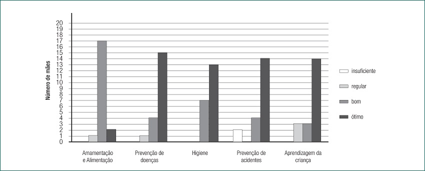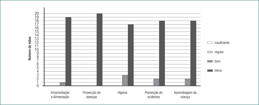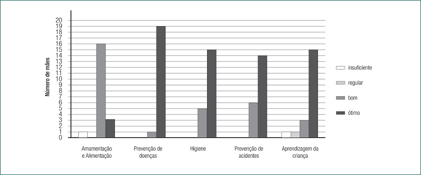 De maneira geral, o conhecimento das participantes variou entre os índices bom e ótimo. No entanto, uma parcela reduzida de mães obteve classificações regulares nos temas sobre amamentação e alimentação, prevenção de doenças e aprendizagem da criança. Houve um índice insuficiente no que se refere à prevenção de acidentes na infância.