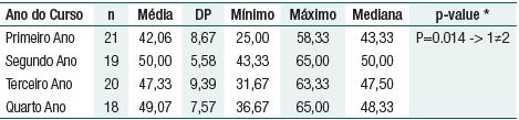 Os estudantes do primeiro ano apresentaram melhor desempenho quando comparados aos demais anos, com significância estatística quando comparado ao segundo (p=0.014).