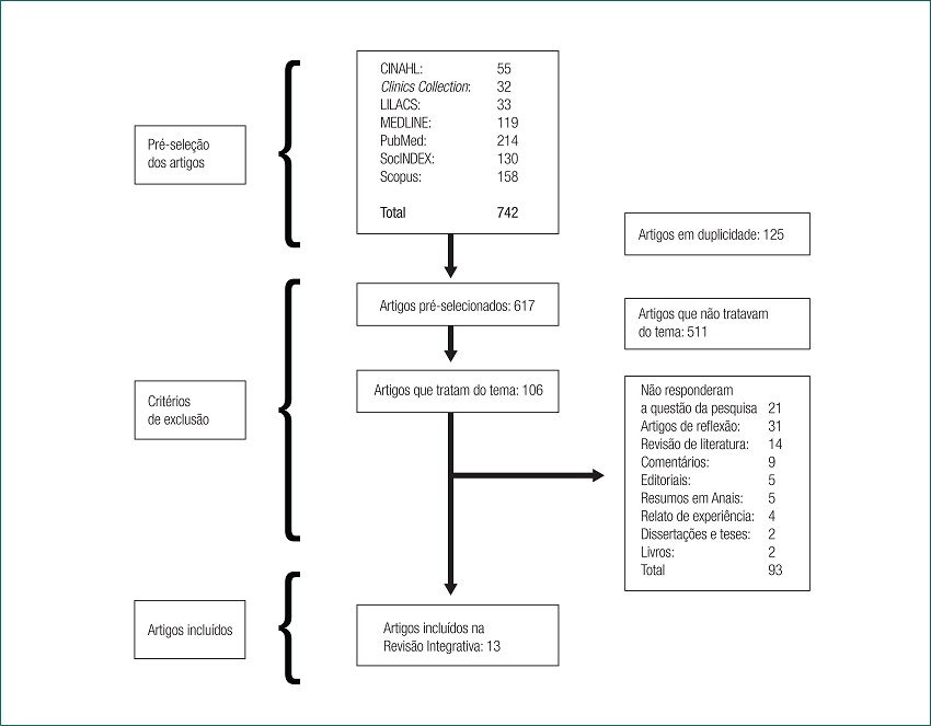 Método: Revisión integrativa de literatura, en la que fueron seleccionados estudios publicados de 2006 a 2015, indexados en las bases CINAHL. Clinics Collection, LILACS, MEDLINE, PubMed, Scopus y SocINDEX. Fueron incluidos 13 estudios.