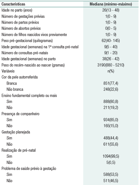 A prevalência de sintomas depressivos entre as puérperas do estudo foi de 6,7% (74 puérperas), sendo o escore máximo obtido na EPDS 26, um único caso. A idade materna mediana foi de 26 anos (13-48 anos); a mediana do número de gestações prévias, partos e filhos nascidos vivos foi 1 (0-9); o número mediano de consultas de pré-natal foi 9 (1-20) e o peso mediano do recém-nascido ao nascer foi 3190 gramas (880-5210 gramas), conforme demonstrado na tabela 1.