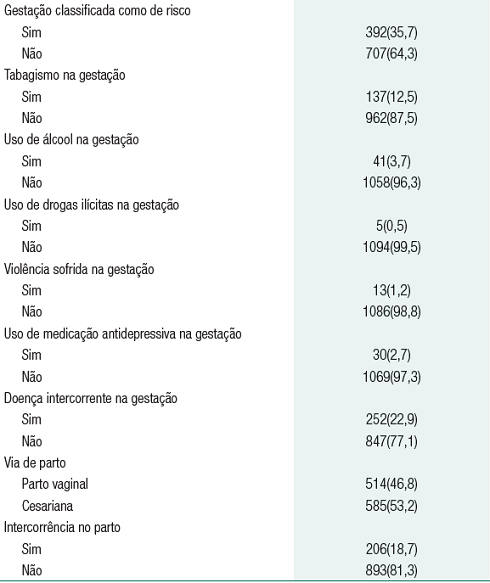 A maioria das puérperas possuía ensino fundamental completo ou mais e possuía companheiro. Quase a totalidade (99,5%) havia feito pré-natal e mais da metade referiu algum problema de saúde durante a gestação. Foram classificadas como gestantes de risco 35,7% das participantes do estudo. O tabagismo esteve presente em 12,5% das gestantes e o consumo de álcool em 3,7% delas. Usaram drogas ilícitas e sofreram violência na gestação aproximadamente 1% das puérperas. O nascimento do recém-nascido por cesariana ocorreu em 53,2% dos casos (Tabela 1).