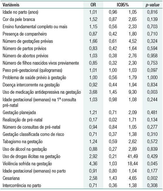 A tabela 3 é relativa ao modelo de regressão logística múltipla final. De maneira independente, uso de medicação antidepressiva na gestação, sofrer violência na gestação e ser submetida à cesariana se associaram à presença de sintomas depressivos maternos. Usar medicação antidepressiva aumentou em duas vezes (OR=2,07, IC 95%=1,12-3,61); sofrer violência na gestação aumentou em quatro vezes (OR=4,06, IC 95%=1,02-16,19) e evoluir para cesariana aumentou em duas vezes (OR=2,07, IC 95%=1,22-3,53) as chances de sintomas depressivos no puerpério imediato.