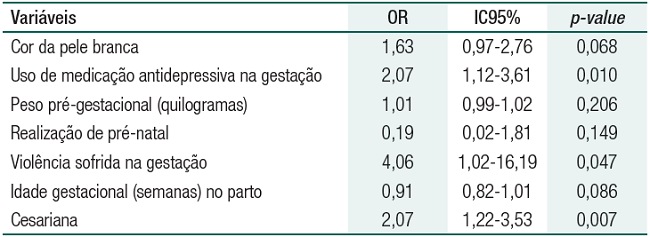 Fatores associados a presença de sintomas depressivos maternos constam da tabela 2. Cor da pele, uso de medicação antidepressiva na gestação, peso pré-gestacional, realização de pré-natal, violência sofrida na gestação, idade gestacional no parto e nascimento por cesariana foram as variáveis selecionadas para serem incluídas no modelo de regressão logística múltipla final (Tabela 3), pois foram as variáveis mais fortemente associadas aos sintomas depressivos no puerpério imediato (p<0,20).