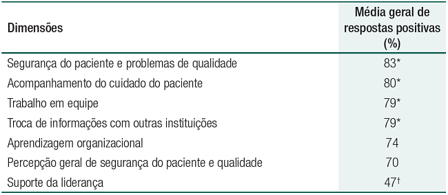 Results: The dimensions “information exchange with other institutions” (79%), “teamwork” (79%), “patient care tracking/follow-up” (80%),“patient safety and quality problems” (83%), while “leadership support for patient safety” (47%) showed to be a weak area. A signifi cant difference was found when comparing the variables length of experience and professional category with the average percentages of positive answers.