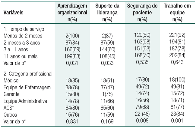 Para a variável “tempo de serviço” apresentaram diferença significativa “aprendizagem organizacional” e “suporte da liderança”, onde quanto menor o tempo de serviço maior a percepção positiva (Tabela 3). Quanto à categoria profissional, o médico foi o que mais apresentou percepção positiva nas dimensões “segurança do paciente e problemas de qualidade” e “trabalho em equipe” (Tabela 3).