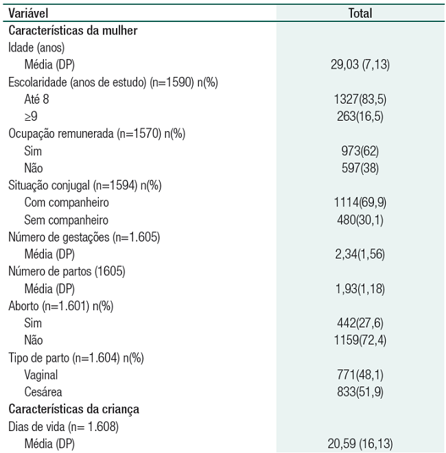 No que se refere às características sócio demográficas, as mulheres atendidas apresentaram idade média de 29 anos (DP=7,1), a maioria estudou por até oito anos (83,4%), exercia trabalho remunerado (62%) e vivia com o companheiro (69,9%). Quanto às características obstétricas, as puérperas tinham, em média duas gestações (DP=1,56; min.1 e máx.13) e dois partos (DP=1,18; min.1 e máx.11), sendo que 27,6% apresentavam história de aborto prévio (min.0 e máx.7), na gestação atual, mais da metade das mulheres foi submetida à cesariana (51,9%) entre elas (Tabela 1).
