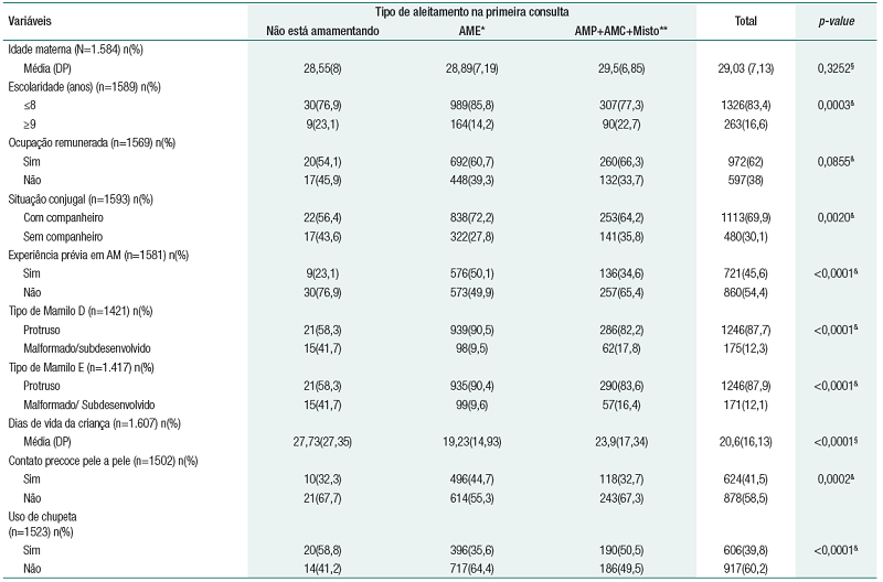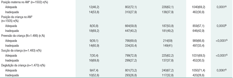 Houve associação significativa entre o tipo de aleitamento materno na primeira consulta e as variáveis: escolaridade materna, situação conjugal, experiência prévia com aleitamento materno, tipo de mamilos, contato precoce pele a pele, percepção materna da quantidade de leite, percepção das mamas antes das mamadas, relato de vazamento de leite, facilidade de extração manual do leite, dias de vida da criança, uso de chupeta, posição da mãe no AM, posição da criança no AM, preensão da criança na mama, sucção da criança na mama e deglutição da criança (Tabela 2 e 3).