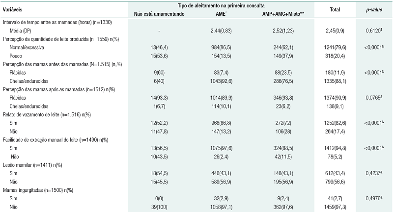 Não houve associação entre o tipo de aleitamento materno, idade e ocupação materna, presença de lesão mamilar, ingurgitamento mamário, percepção das mamas após as mamadas e o intervalo de tempo entre as mamadas (Tabela 2 e 3).