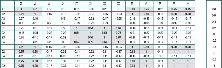 Antes de verificar a consistência interna do instrumento, verificou-se se os aspectos estavam mensurando a mesma variável. Percebeu-se altas correlações entre os itens A1, A2, C1, C2, D1, D2, enquanto que os itens do Bloco B se apresentaram correlacionados consigo mesmos. Os itens C3, D3, D4 não estão presentes por apresentaram desvio-padrão igual a zero (Figura 1). Com isso, afirma-se que os aspectos Aparência Geral e Facilidade de entendimento, para os Blocos A, C e D, medindo a mesma variável, foram considerados como um único aspecto. Como o Bloco B tratou de sinais de perigo, tendo aspectos distintos dos outros três blocos, há probabilidade de afirmar que os itens desse bloco estejam medindo uma mesma variável sobre a qualidade dos itens de sinais de perigo.