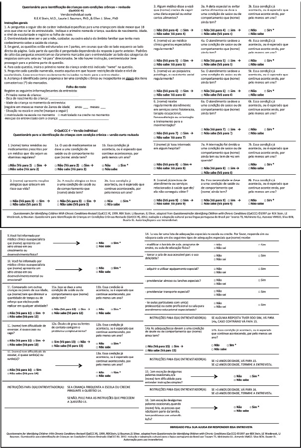 Objetivo: Realizar a tradução e adaptação cultural do Questionnaire for Identifying Children With Chronic Conditions-Revised (QuICCC-R, publicado em 1999) para a língua portuguesa do Brasil. O questionário foi desenvolvido para identificar crianças com condições crônicas por meio da aplicação, aos seus pais ou responsável, de 16 questões sobre as repercussões dessas condições, como limitações funcionais, dependência de mecanismos compensatórios ou de cuidados e utilização de serviços acima do esperado para a idade. O método utilizado é independente de diagnósticos. A aplicação do questionário pode ser feita pessoalmente ou por telefone, com duração média de 2 minutos.