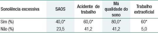 Na tabela 2, observa-se que 05 policiais militares (22,7% da amostra) apresentaram sonolência diurna excessiva caracterizada por uma pontuação maior do que 10 pontos na Escala de Epworth. Observou-se que o grupo de policiais com sonolência excessiva apresentou significativa (p<0,05) maior prevalência de SAOS, acidentes de trabalho e má qualidade de sono. Observou-se ainda que dentre os policiais com sonolência excessiva, 60% relataram possuir trabalho extraoficial.