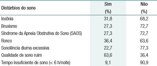 A tabela 3 mostra a prevalência de distúrbios relacionados ao sono na amostra analisada. Observou-se que 63,6% dos policiais do estudo apresentaram má qualidade de sono (definida como um escore > 5 pontos na Escala de Pittsburgh) e que 100% dos participantes apresentaram ao menos algum tipo de distúrbio ou queixa relacionada ao sono.