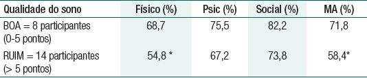 Na tabela 5 observam-se melhores escores de qualidade de vida em todos os seus domínios nos participantes com boa qualidade de sono. Entretanto, houve significância estatística apenas no domínio físico e no domínio do meio ambiente. Possivelmente, se a amostragem fosse maior, poderíamos encontrar significância estatística em todos os domínios.