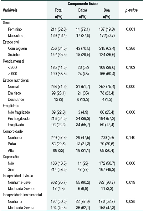 Estudo observacional transversal com fatores analisados em relação à qualidade de vida. Os dados foram extraídos da “Pesquisa FRALLE”(18) consistindo em 172 perguntas feitas através de instrumentos de medição validados, que medem a fragilidade, o risco de desnutrição e a qualidade de vida relacionada à saúde (HRQoL). Os dados foram coletados ao longo do ano de 2015. A amostra foi formada por indivíduos não institucionalizados com idade superior a 75 anos. O estudo incluiu pessoas de ambos os sexos, residentes em domicílios familiares, que tinham cartões de saúde e concordaram em participar do estudo, além de pessoas com déficit cognitivo com acompanhante (nesse caso, perguntas relativas a dados subjetivos não foram feitas). Indivíduos em estágios terminais da vida, institucionalizados, com déficit cognitivo e sem acompanhante, bem como aqueles que não aceitaram participar, foram excluídos. A amostra foi obtida através de amostragem intencional em consultas de enfermagem em unidades de atenção primária à saúde no departamento de Castellón (Espanha). Uma amostra de 400 indivíduos foi obtida de acordo com o cálculo estabelecido. Qualidade de vida: medida através do questionário de saúde Short-Form 36(19,20) consistindo em 36 itens em uma escala de 0 (pior estado de saúde) a 100 (melhor estado de saúde). Os itens são organizados em 8 dimensões, divididos em duas escalas: um componente físico (funcionamento físico, funcionamento da função física e dor no corpo) e um componente mental (saúde mental, funcionamento da função emocional, funcionamento da função social e vitalidade). A qualidade de vida foi categorizada como boa (pontuação maior ou igual a 50) ou ruim (abaixo de 50). Sociodemografia: Estado civil (“Sozinho” para pessoas que viviam por conta própria em suas casas e “Com alguém” quando viviam com um familiar ou cuidador). Renda mensal (< 900 euros e > 900 euros) e sexo (feminino e masculino). Risco de desnutrição: medido através do formulário simplificado Mini Avaliação Nutricional (MNA-SF)(21) consistindo de 6 perguntas com uma pontuação máxima de 14. Uma pontuação entre 12 e 14 indica “estado nutricional normal”, entre 8 e 11 “em risco de desnutrição” e de 0 a 7 “subnutrido”. A fragilidade foi definida de acordo com os critérios de Fried et al.:(17) Os indivíduos foram considerados “fragilizados” quando apresentavam três ou mais critérios de fragilidade, “pré-fragilizados” quando apresentavam um ou dois critérios, e “não fragilizados” quando não apresentavam nenhum critério. A comorbidade foi medida com o índice de Charlson,(22) cuja pontuação total é 37, e considera-se comorbidade a pontuação ≥ 3. Atividades básicas da vida diária (ABVD) foram medidas com a escala Lawton-Brody.(23) Uma pontuação de 0 a 1 foi considerada “sem ou com leve incapacidade”, pontuações de 2 ou mais foram consideradas “incapacidade moderada-severa”. Atividades instrumentais da vida diária (AIVD) também foram medidas com a escala de Lawton-Brody,(24) categorizadas da seguinte forma: ausência e incapacidade instrumental (incapacidade de executar 1 ou mais das atividades). Sintomas de depressão: a Escala de Depressão do Centro de Estudos Epidemiológicos (CES-D)(25) foi utilizada para medir a presença de sintomas de depressão. Ela contém um questionário com 22 itens e uma pontuação ≥17 indica depressão.