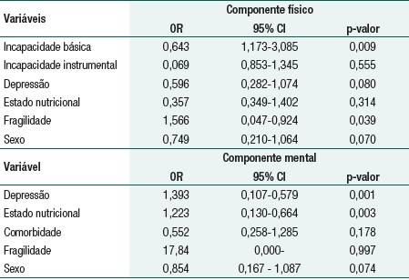 Ao analisar o efeito das variáveis associadas aos componentes da qualidade de vida no modelo estimado (Tabela 3) as variáveis que explicaram o componente físico da qualidade de vida foram fragilidade e incapacidade básica. O risco de apresentar baixa qualidade de vida física foi 1,5 vezes maior entre idosos fragilizados que em não-fragilizados (OR=1,566, CI=0,047-0,924) e o risco de apresentar uma pontuação baixa no componente físico da qualidade de vida foi 0,6 vezes maior entre idosos com incapacidade básica para atividades da vida diária. Para o componente mental da qualidade de vida (Tabela 3) as variáveis que o explicam são estado nutricional (OR=1,393, CI=0,107-0,579) e sintomas de depressão (OR=1,223, CI=0,130-0,664).