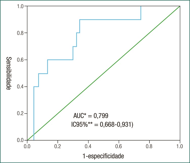 Na tabela 1, verifica-se que o escore do IDATE-estado não foi um preditor da ocorrência de arritmias não fatais. A capacidade preditiva do modelo está demonstrada na figura 1.