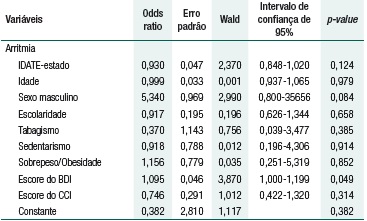 Quanto aos desfechos de interesse, na análise univariada, o CCI apresentou correlação significativa com o escore do IDATE-traço (r=0,329, p=0,001), mas não com o escore do IDATE-estado (r=0,109, p=0,282). Por sua vez, não houve associação entre a classificação Killip com os escores de ansiedade traço (p=0,742) ou estado (p=0,550), nem correlação entre o tempo de permanência hospitalar com tais escores (r=-0,017, p=0,870 e r=0,061, p=0,547, respectivamente). Não se observou associação entre a ocorrência de arritmias com os escores de ansiedade traço (p=0,960) ou estado (p=0,250), mas o modelo de regressão (Tabela 1) evidencia a relação entre a ocorrência de arritmias não fatais e escore de depressão, influenciada pela ansiedade-estado.