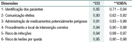 A média de idade dos juízes que validaram o instrumento foi de 41±9 anos, tempo médio de experiência em hemodiálise de 10±8 anos e 13 (92,8%) eram pesquisadores da área de segurança do paciente ou hemodiálise. O CCI geral do instrumento foi de 0,98, com p <0,001, e o Coeficiente de cada dimensão está apresentado a seguir ( Tabela 1 ).