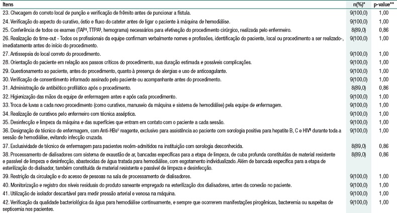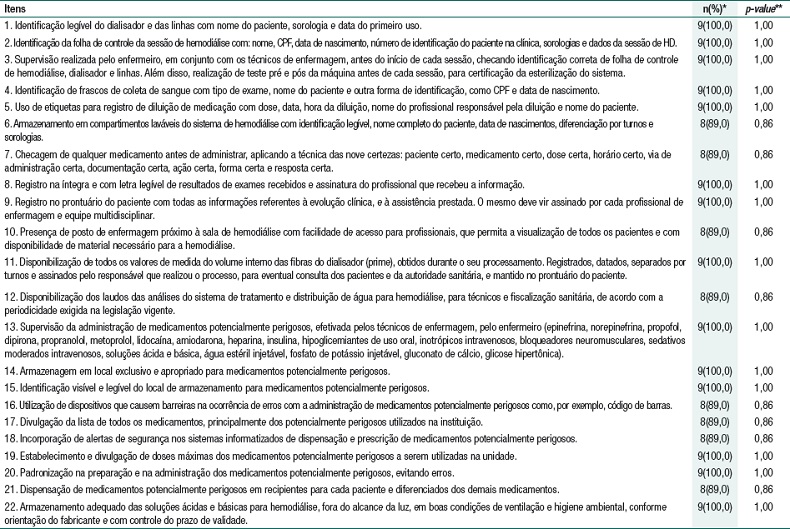 A dimensão “Medicamentos potencialmente perigosos” possui dez itens. Sua presença no instrumento se justifica por pacientes em diálise requererem regimes complexos com multidrogas,(2) principalmente por serem drogas de alta vigilância, a exemplo da heparina, que possui alta incidência de complicações hemorrágicas.(15)
