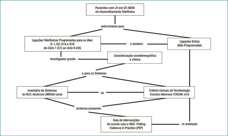 Estudo descritivo, prospectivo, de natureza quantitativa. O estudo foi conduzido no Ambulatório de Linfomas do Hospital São Paulo, Universidade Federal de São Paulo, São Paulo, Brasil. A amostra foi não probabilística, composta por pacientes incluídos consecutivamente, a partir dos critérios de inclusão: diagnóstico de LH, maiores de 18 anos, com previsão de iniciar e finalizar o esquema quimioterápico, ABVD, entre novembro de 2015 a fevereiro de 2017. Os critérios de exclusão foram: pacientes com tratamento quimioterápico anterior, qualquer esquema; não possuir acesso a telefonia móvel ou fixa.