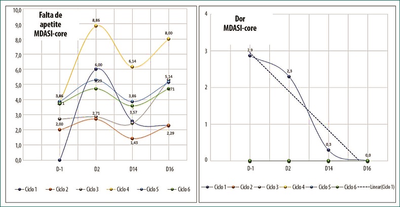 A falta de apetite se manifestou com maior apresentação sintomática no 4º ciclo, atingindo o escore de 8,86; entre os ciclos, a média foi de 5,29. Observa-se a progressão acentuada no 4º ciclo, entre período antes e após a quimioterapia citotóxica, sendo as diferenças estatisticamente significativas (p = 0,02) (Figura 3). O relato de dor foi observado em três pacientes, todos com presença de massa bulky mediastinal no estadiamento, com escore máximo relatado de 7. Observe que a incidência de dor se localiza no ciclo 1, diminuindo a gradação do sintoma entre o D-1 ao D16, até anular-se (Figura 3).