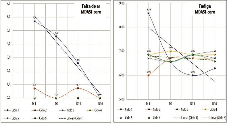 A falta de ar foi uma queixa constante no primeiro e segundo ciclo, com média de 5,7, regredindo para zero a partir do 3º ciclo (p= 0,02). Os pacientes com massa bulky apresentaram os maiores níveis de gradação. A fadiga foi o único sintoma que esteve presente antes do C1 e perdurou até o último ciclo. No 1º ciclo a média do sintoma foi de 8,58, mantendo-se não inferior a gradação 6 até o C6. Mesmo mantendo-se elevada, houve melhora do escore da gradação do C1 ao C6 (P = 0,03) (Figura 4).