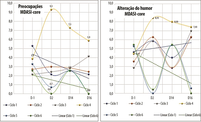 A queixa de preocupações apresentou-se oscilante, com pico de gradação de 9,29 no C4. O D16, do C6, foi o único momento de avaliação no qual todos os participantes atestaram ausência de preocupações. O logaritmo linear apresentado no gráfico correlaciona o C1 (D-1 com média de 5,3) e o C6 (com gradação zero no D16), gerando resultado estatisticamente significativo (p=0,02). A alteração do humor foi maior no C4 e de maneira bastante oscilante nos demais ciclos. Nos ciclos C2 e C5, ambos na ligação telefônica do D16, os escores de gradação apresentaram-se próximos a zero. Na análise comparativa do C1 com o C2 a diferença foi estatisticamente significativa (p=0,02) (Figura 5).