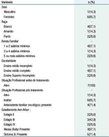 Os dados da presente investigação foram gerados por 286 ligações telefônicas, provenientes de sete pacientes diagnosticados com LH e submetidos a 6 ciclos de ABVD. A maioria dos participantes era do sexo feminino (85,7%), caucasianos (57,1%), com 12 ou mais anos de escolaridade, renda mensal familiar média de 1,7 salários mínimos (aproximadamente, U$ 297/mês) e média de idade de 29,8 anos (DP 7,33), e com antecedente familiar oncológico. Clinicamente, 71,5 dos pacientes em estádios avançados, maioria com sintomas B e massa bulky, conforme o estadiamento Ann Arbor, com base na modificação de Cotswolds.(14) Dados absolutos e percentuais demonstrados na tabela 1.