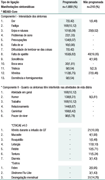 Results: Two hundred and eighty-six telephone calls generated 1,870 symptomatic complaints. In scheduled calls, the most prevalent complaints were fatigue, distress, lack of appetite, vomiting and nausea. As for the interference in daily life activities, the items related to general activities, work, difficulty walking, and mood changes were reported more frequently. In unscheduled calls, lack of appetite and irregular menstruation were the most recurring complaints. The analysis of the progression of symptoms showed an increase in nausea and vomiting (p=0.02), decrease in fatigue and shortness of breath (p≤0.03), improvement in sleep (p=0.02) and decrease of stress (p=0.02).