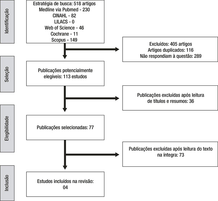 A busca no MEDLINE, via portal PubMed, resultou em 230 artigos, dos quais 197 foram excluídos, 121 não respondiam ao objeto do estudo, 12 eram artigos com resumo indisponível, 63 duplicados e um livro, resultando em 33 artigos selecionados. Após leitura na íntegra, 12 foram retirados, por não corresponderem ao objeto de estudo, e 20, por não serem estudos experimentais, resultando em um único artigo incluído na amostra. Nas bases de dados LILACS e Scielo, as buscas resultaram em nenhum artigo. As buscas na base CINHAL resultaram em 82 artigos, dos quais 65 foram excluídos (49 não respondiam ao objeto do estudo, três sem resumo disponível, 13 repetidos) e 17 foram selecionados. Após leitura na íntegra, os 17 artigos foram excluídos. Na Scopus, foram encontrados 149 artigos, destes, 98 não se adequavam ao objeto do estudo, quatro publicações tinham resumo indisponível, 32 eram repetidos e 15 foram selecionados para leitura na íntegra. Apenas um foi incluído na amostra. Em relação à Cochrane , dos 11 artigos encontrados, quatro foram excluídos por estarem duplicados, cinco por não estarem relacionados à temática do estudo e dois foram selecionados para leitura na íntegra, todavia, nenhum artigo selecionado foi incluído na amostra. Na base Web Of Science , dos 46 artigos encontrados, 10 foram selecionados, quatro estavam repetidos e quatro foram excluídos por não serem estudos experimentais randomizados, resultando em dois estudos incluídos na amostra. Concluído o processo de elegibilidade, quatro artigos foram incluídos para sumarização dos dados, caracterizados no quadro 1 .