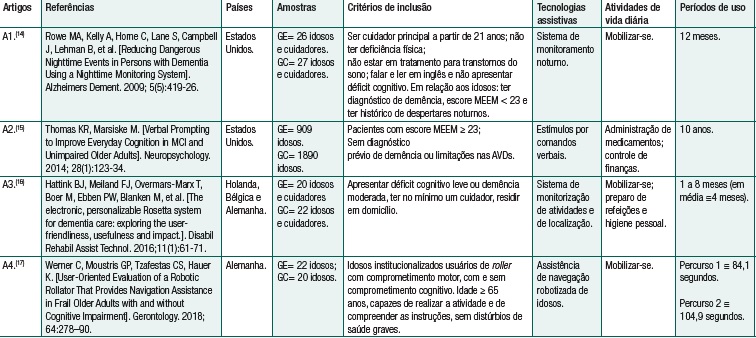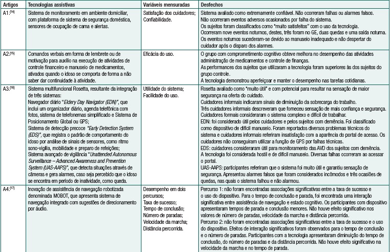 Estudos que abordem as tecnologias assistivas na perspectiva de produzir conhecimento são úteis e necessários para promoção da qualidade de vida de idosos com demência. Assim, objetivou-se analisar estudos de intervenções com tecnologias assistivas, empregadas no auxílio de idosos com demência, na execução de ABVD e AIVD.