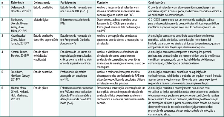 Conclusion: The studies analyzed evidenced that clinical simulation contributed to the teaching of advanced practice nursing, enhancing the clinical awareness and competency building for advanced clinical management, leadership and teamwork skills; most studies involved postgraduate students.