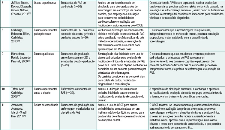 A maior concentração de artigos (83,3%) foi em revistas da área de educação em enfermagem, evidenciando a importância da simulação para a aprendizagem da prática avançada em enfermagem no ensino. A simulação foi empregada para ensino e avaliação das habilidades específicas do enfermeiro de PAE, empregaram simulações cênicas (com pacientes padronizados) e robóticas (com simuladores de alta e média fidelidade). As simulações foram utilizadas com objetivos de treinar o avaliar os enfermeiros quanto a habilidades de comunicação, específicas de cuidados críticos, situações de emergência e clínica médica. Dos 11 artigos incluídos, dez (90,9%) abordaram o uso da simulação para o ensino e treinamento de competências com enfermeiros que cursavam pós-graduação; apenas um estudo foi direcionado ao treino de habilidades práticas avançadas para graduandos, o que corrobora com a definição de prática avançada de enfermagem estabelecida pelo ICN. Ainda, entre os estudos analisados a definição de PAE foi apontada em apenas dois artigos (18,2%). A simulação foi realizada em distintos cenários com casos clínicos em diversas especialidades, como gastrointestinal e neurológico, cuidado intensivo neonatal, pós-operatório de pneumonectomia, dor torácica e avaliação cardíaca, ventilação mecânica e atendimento domiciliar. Quanto às estratégias utilizadas nas simulações, em seis (54,5%) artigos foram utilizados atores nos papéis de pacientes durante o cenários e em cinco (45,45%) manequins, sendo estes cinco de alta fidelidade.