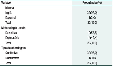 De acordo com a Tabela 2, a maioria dos artigos foram publicados em inglês (97,0%), independente do país de desenvolvimento dos estudos. A metodologia foi principalmente descritiva (57,6%) e exploratória (42,4%), com abordagens de pesquisa qualitativas (97,0%).