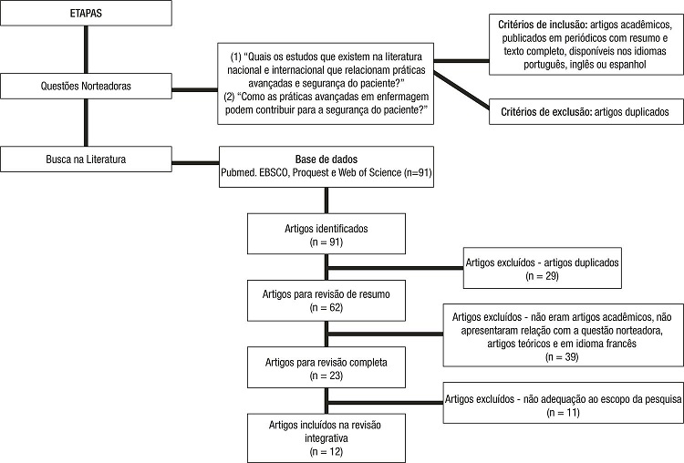 Methodology: An integrative review study was conducted in the indexed databases of PubMed, EBSCO, Proquest and Web of Science from June to August 2018 to answer the guiding questions: (1) What studies in the national and international literature relate advanced practices and patient safety?; and (2) How can advanced practices in nursing contribute to patient safety? The inclusion criteria were: academic articles published in journals (abstract and full text) in Portuguese, English or Spanish, adopting an empirical method of investigation of the study subject. The study had no restriction regarding the publication year.