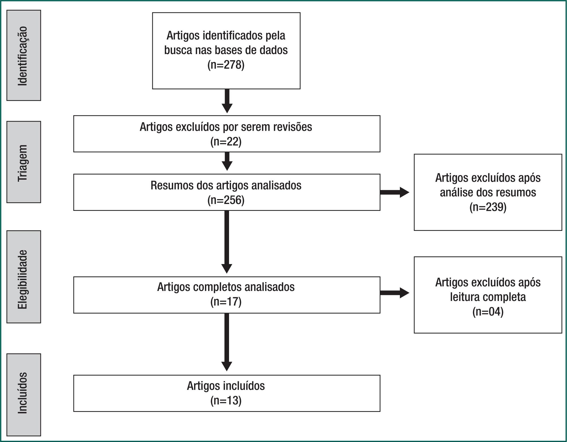 Encontrou-se um total de 278 artigos, distribuídos: 169 no Pubmed, 109 no Science direct. Após a pré-seleção, seguiu-se a leitura dos títulos e resumos. Os estudos excluídos nesta etapa foram: 22 artigos por serem de revisão; 239 por não atenderem aos critérios de inclusão ou exclusão; restaram 17 artigos. Esses artigos foram lidos na íntegra visando a averiguar se tratavam da formação em enfermagem rural, nessa etapa quatro artigos foram excluídos por abordarem populações indígenas, totalizando uma amostra de13 artigos (Figura 1).