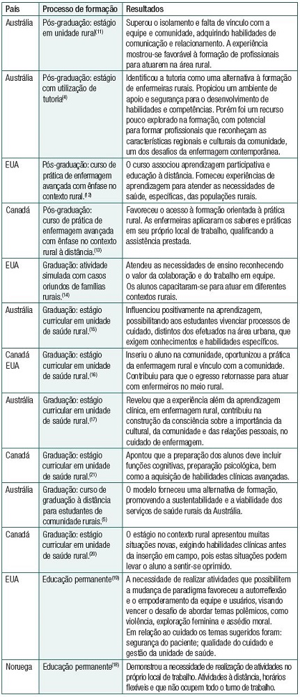 Dentre as estratégias implementadas destacou-se a criação de curso de bacharelado em enfermagem à distância na Austrália;(5,15) cursos de prática avançada em enfermagem rural(12,13) e atividades curriculares de estágios em unidades rurais para graduandos e recém-formados.(4,15-18,21) Essas experiências tiveram como principal objetivo a formação de enfermeiras que se dispusessem a trabalhar e viver na área rural.(4,5)