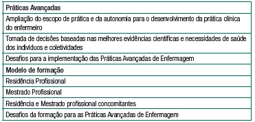 Resultados: As categorias empíricas construídas foram: ampliação do escopo de prática e da autonomia para o desenvolvimento da prática clínica do enfermeiro, tomada de decisões baseadas nas melhores evidências científicas e necessidades de saúde dos indivíduos e coletividades, formação profissional (residência profissional, mestrado profissional, residência e mestrado profissional concomitantes) e desafios para a formação e a implementação das Práticas Avançadas de Enfermagem.
